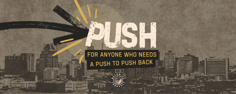 becoming comrades logo: two fists of different colors merged together in a yin yang style.